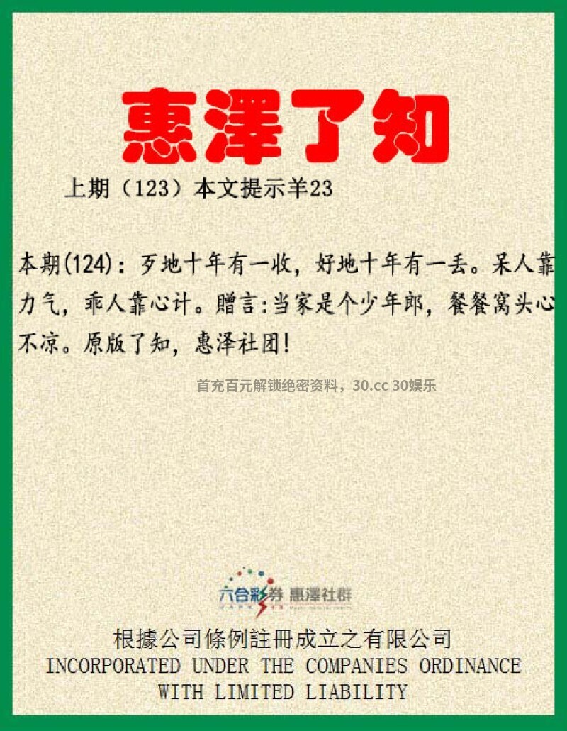 【惠泽了知】127期:面前的田地要放得宽,使人无不平之叹;解地肖鼠虎蛇羊鸡狗。身后的惠泽要流得长,使人有不匮之思。解后肖马羊猴鸡狗猪。贈言:狂言千句如粪土,良言一句值千金。